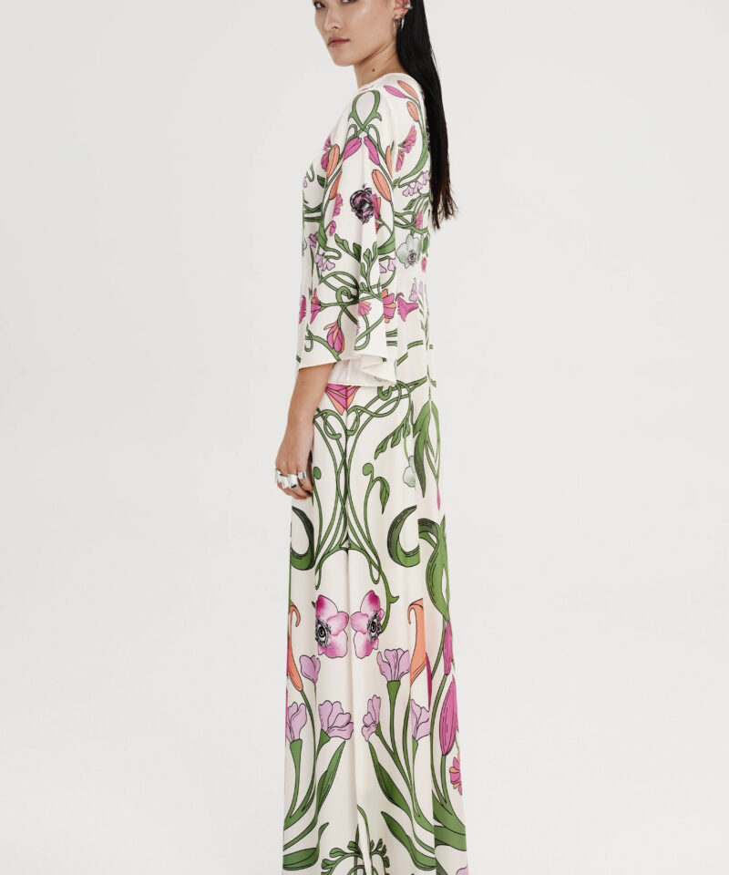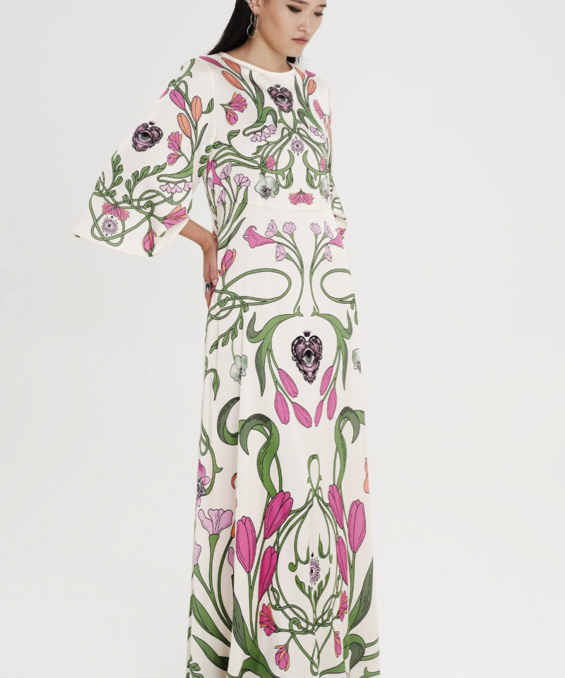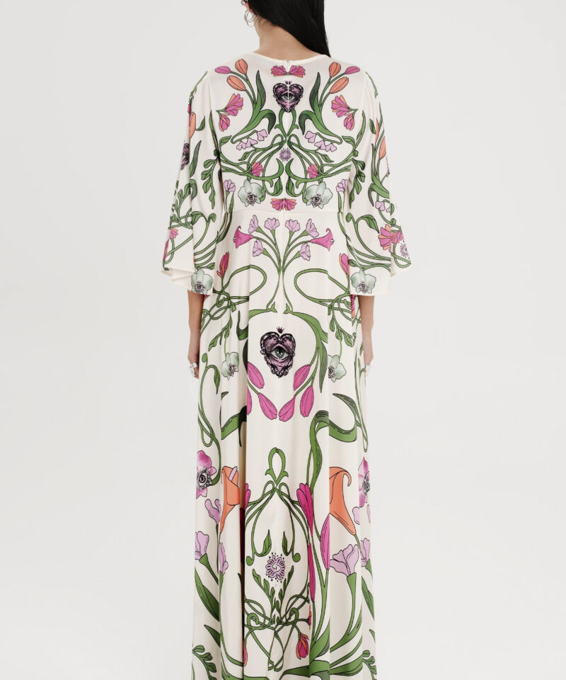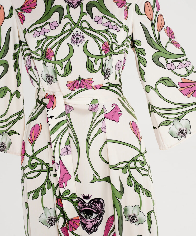 Το Fleur Dress ξεχωρίζει με τα σύμβολα και τα floral σχέδιά του. Έχει placement print σε απαλούς τόνους πάνω σε ecru σατέν jacquard ύφασμα και Α-γραμμή. Τα ¾ καμπάνα μανίκια του προσθέτουν κίνηση, ενώ το κρυφό φερμουάρ και η ζώνη από το ίδιο ύφασμα ολοκληρώνουν το σύνολο. Είναι ένα αέρινο, silky φόρεμα, ιδανικό για events και ιδιαίτερες περιστάσεις.