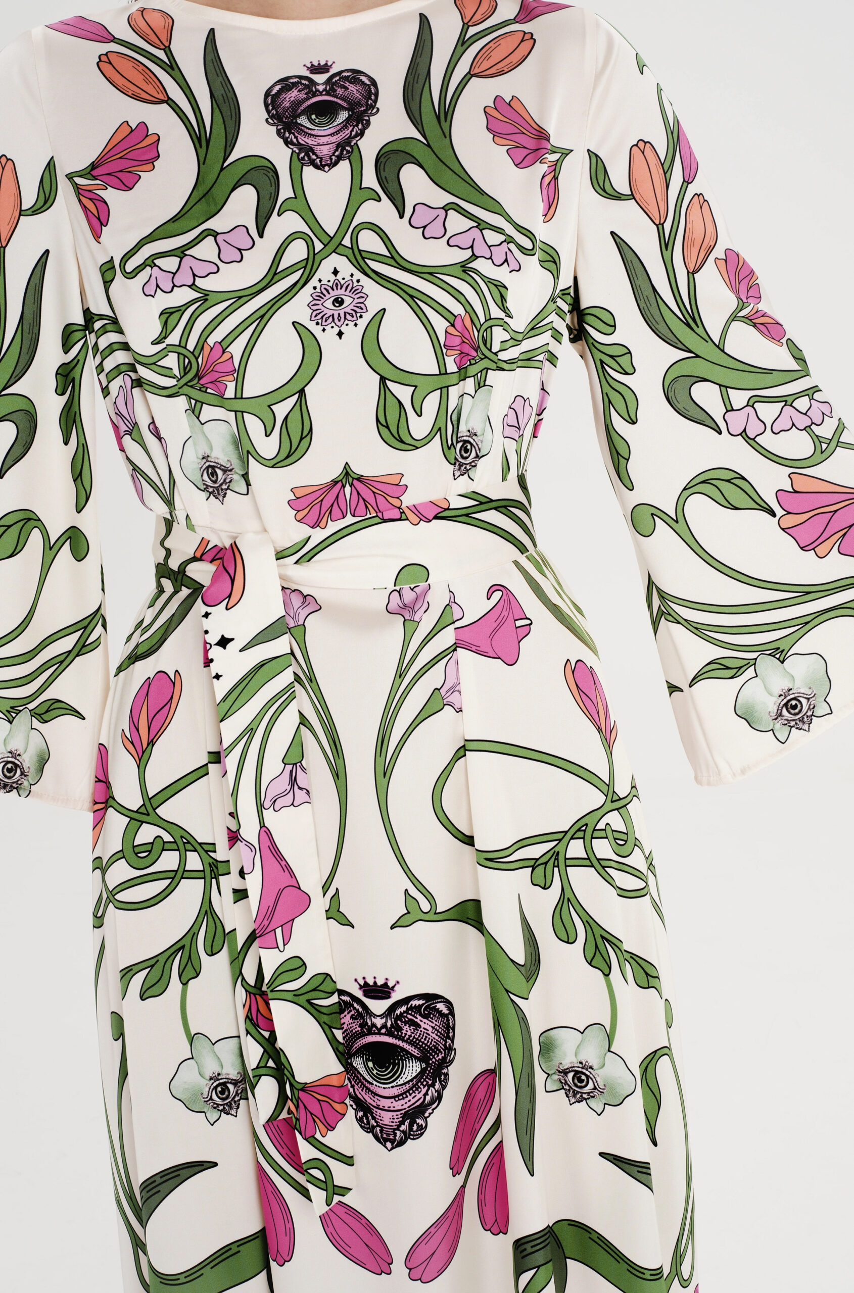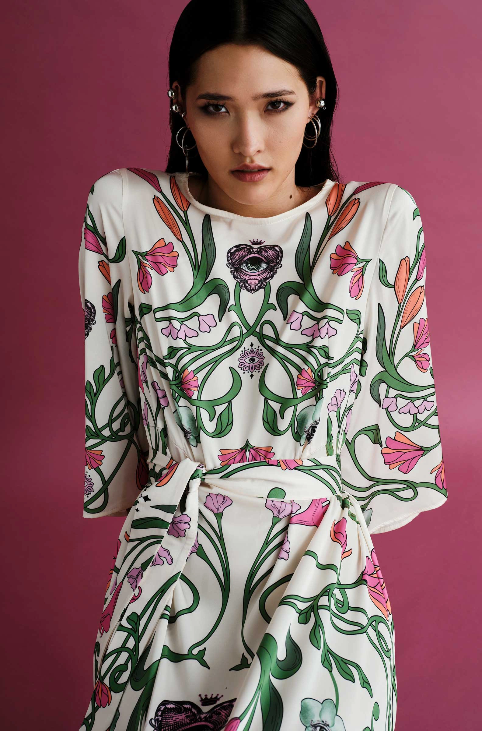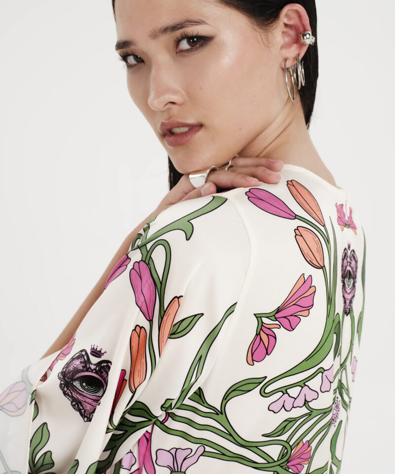 Το Fleur Dress ξεχωρίζει με τα σύμβολα και τα floral σχέδιά του. Έχει placement print σε απαλούς τόνους πάνω σε ecru σατέν jacquard ύφασμα και Α-γραμμή. Τα ¾ καμπάνα μανίκια του προσθέτουν κίνηση, ενώ το κρυφό φερμουάρ και η ζώνη από το ίδιο ύφασμα ολοκληρώνουν το σύνολο. Είναι ένα αέρινο, silky φόρεμα, ιδανικό για events και ιδιαίτερες περιστάσεις.