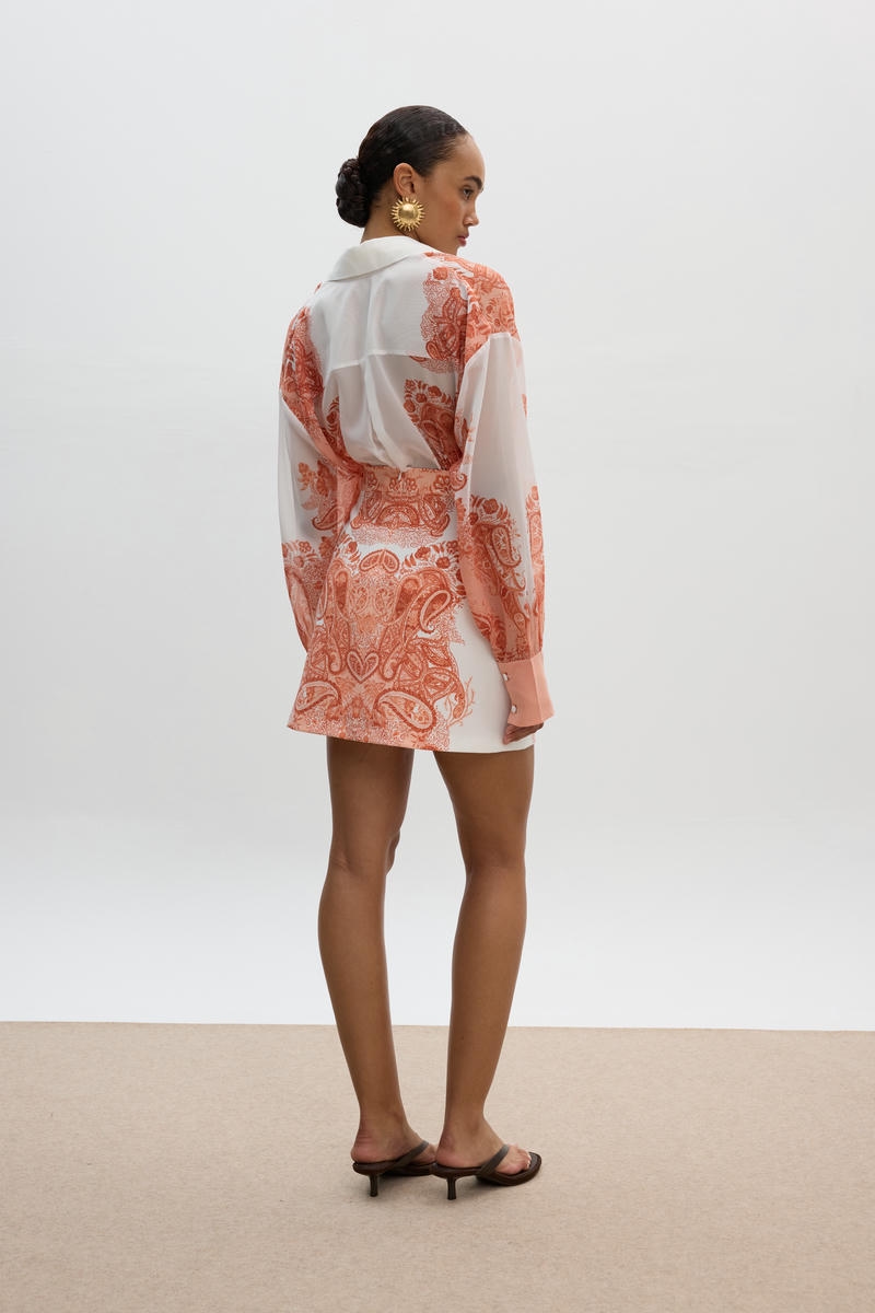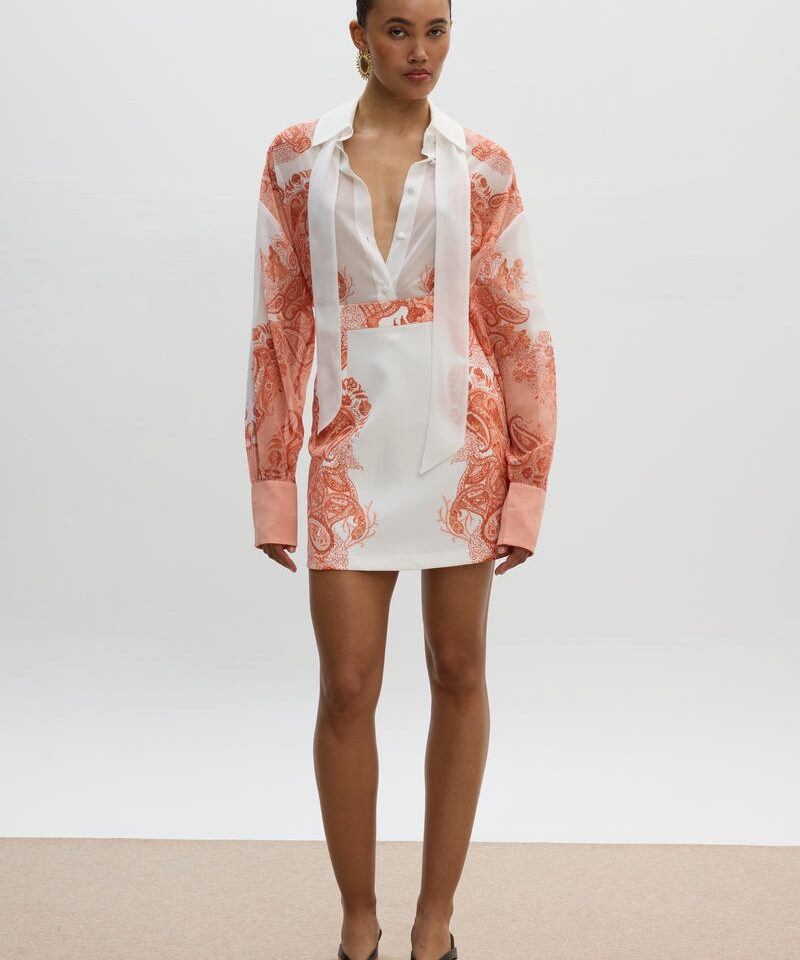 Το Grace Shirt , αποτελεί το απόλυτο statement κομμάτι που συνδυάζει την κλασική κομψότητα με μια καλλιτεχνική πινελιά. Αυτό το λευκό πουκάμισο ξεχωρίζει για τον minimal αλλά παράλληλα δυναμικό χαρακτήρα του , χάρη στην μοναδική τοποθέτηση ενός μοναδικού pattern.Το προσεκτικά σχεδιασμένο μοτίβο δεν είναι απλώς μια λεπτομέρεια, αλλά μια έκφραση στυλ που μετατρέπει το κλασσικό σε ξεχωριστό. Η ισορροπία μεταξύ της καθαρής βάσης και των ζεστών, ζωηρών τόνων του pattern, δημιουργεί ένα εντυπωσιακό οπτικό αποτέλεσμα. Συνδυάζεται υπέροχα με την αντίστοιχη φούστα για ολοκληρωμένα effortless-chic εμφανίσεις.Hand painted print, το οποίο σχεδιάστηκε αποκλειστικά για την SS25 CIEL CONCEPT COLLECTION.Κατασκευαζεται εξ’ ολοκλήρου στην Ελλάδα σε περιορισμένη διαθεσιμότητα αποκλειστικά για την CIEL CONCEPT
