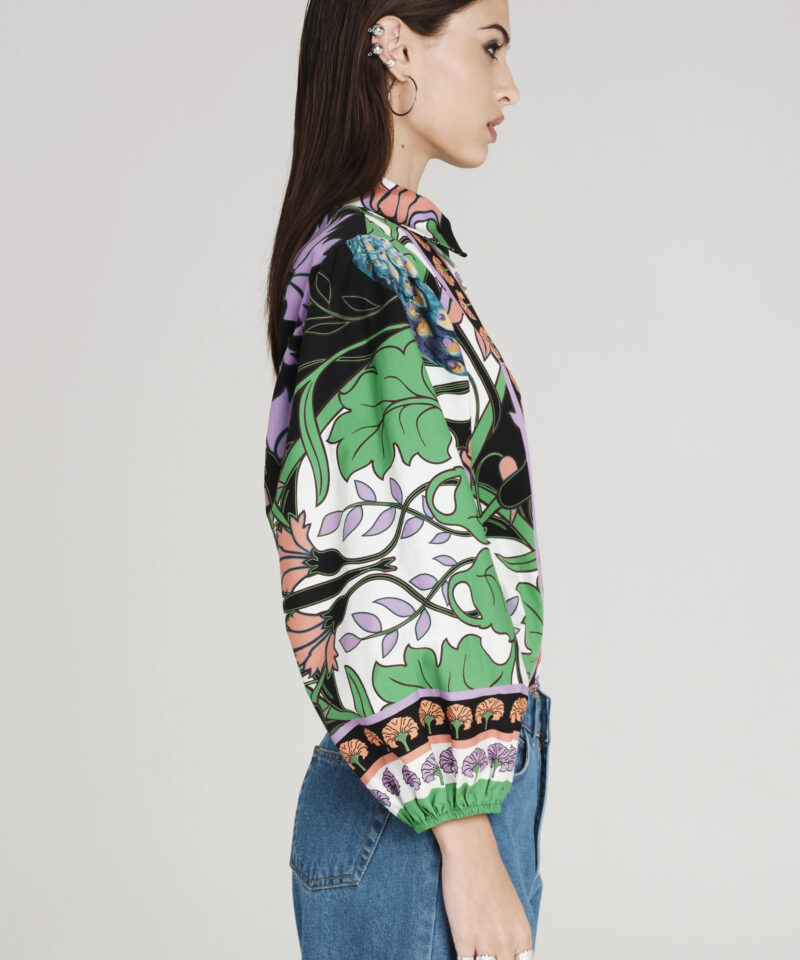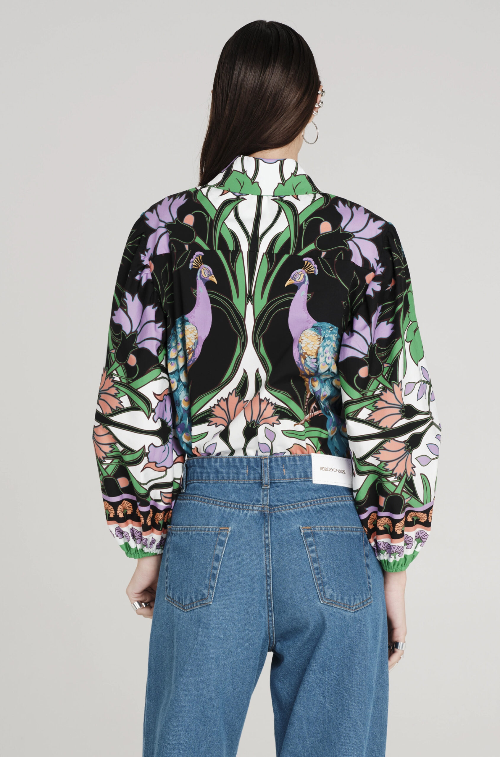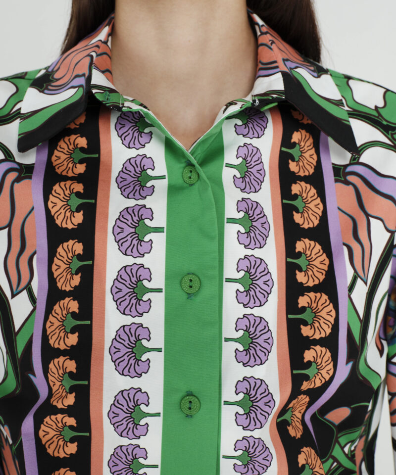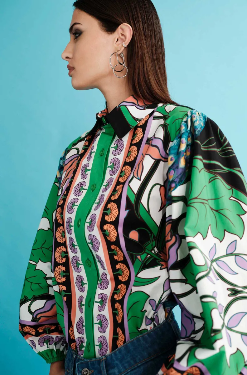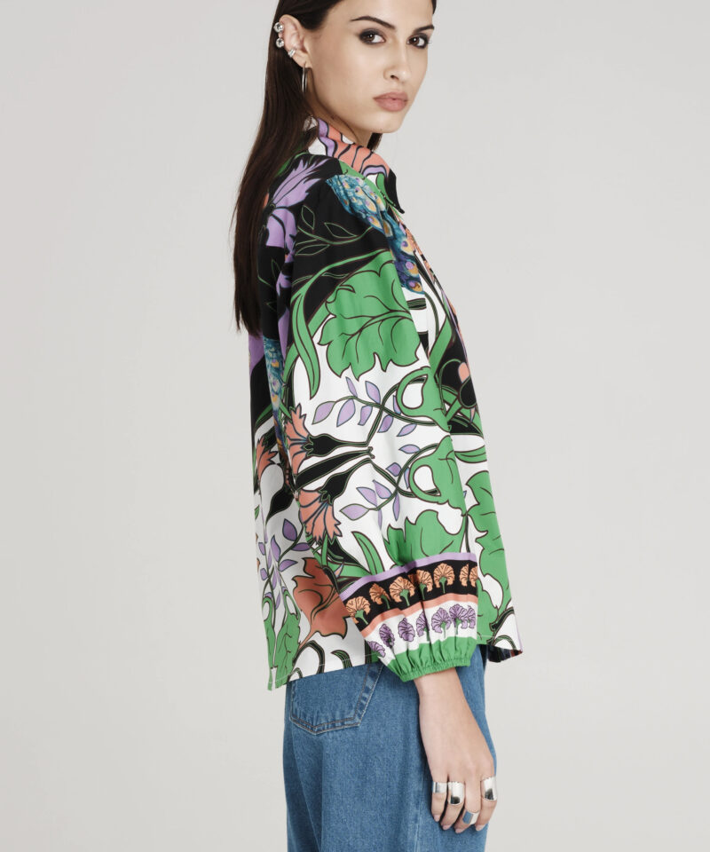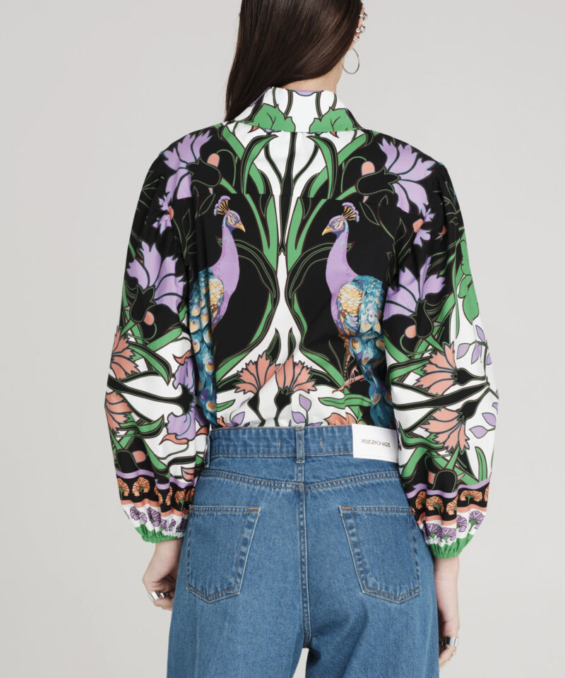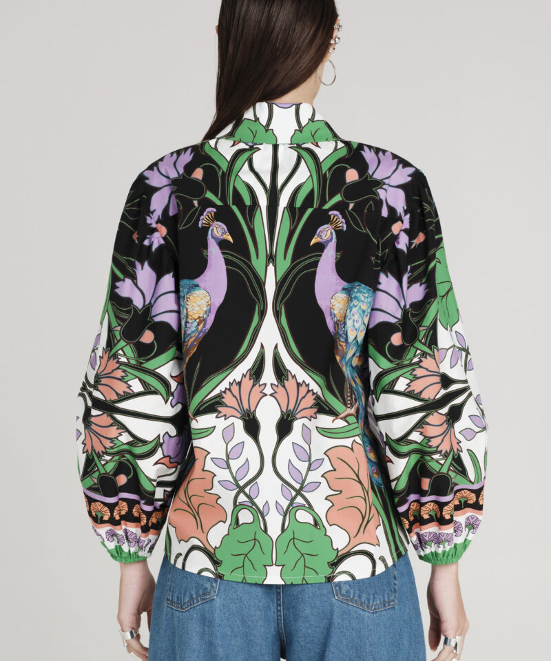 Το Nostalgia Shirt ξεχωρίζει με τα έντονα χρώματά του και τα ιδιαίτερα σχέδια με παγώνια και λουλούδια. Έχει μακριά μανίκια που καταλήγουν σε ελαστικές μανσέτες και κλείνει μπροστά με textured κουμπιά. Είναι κατασκευασμένο από βαμβακερό poplin ύφασμα με ελαφριά ελαστικότητα, προσφέροντας άνεση.