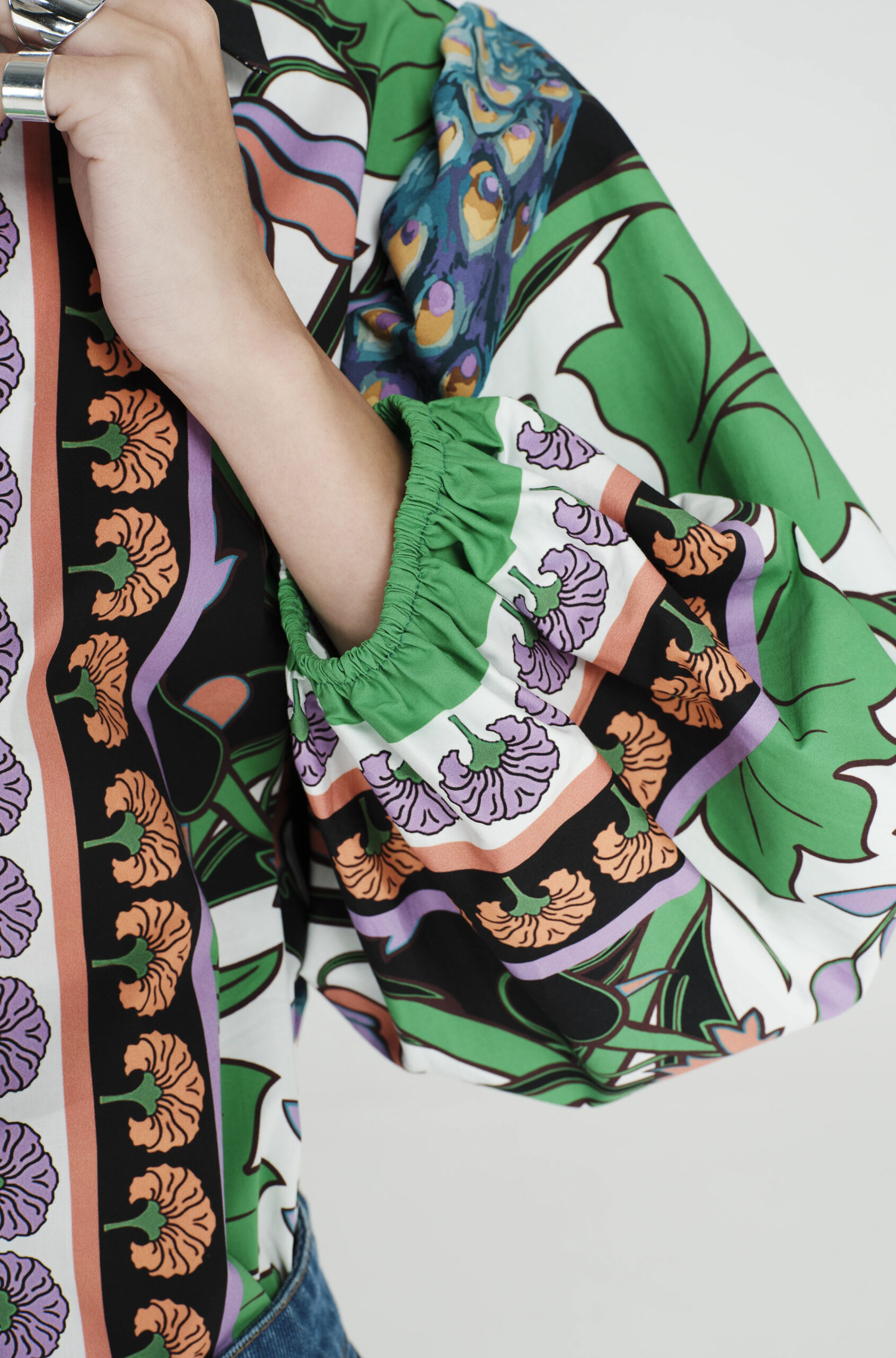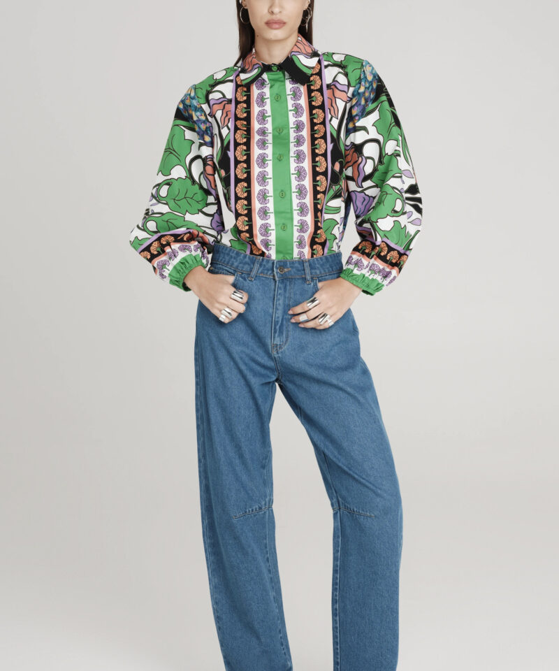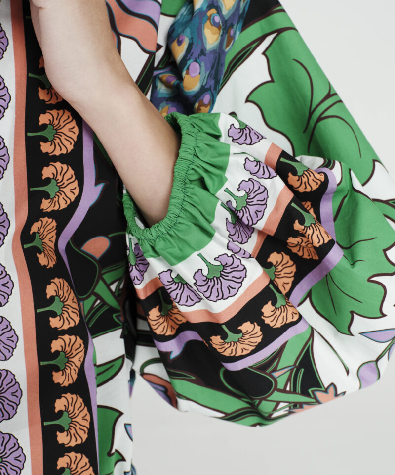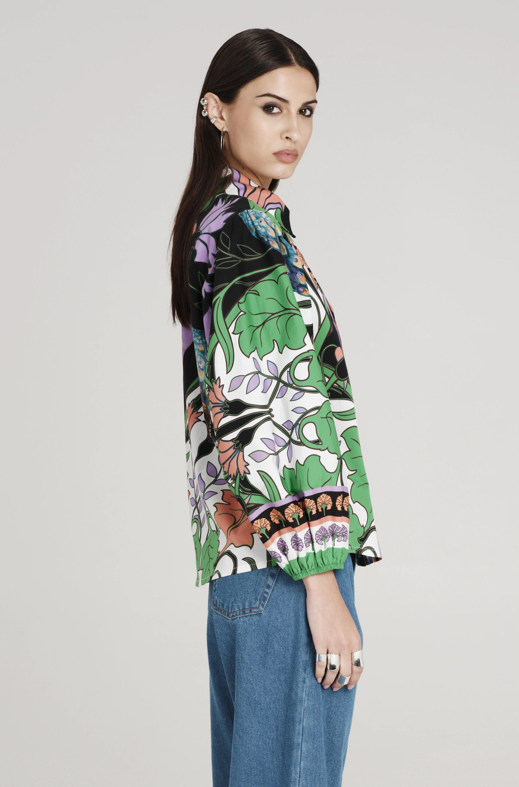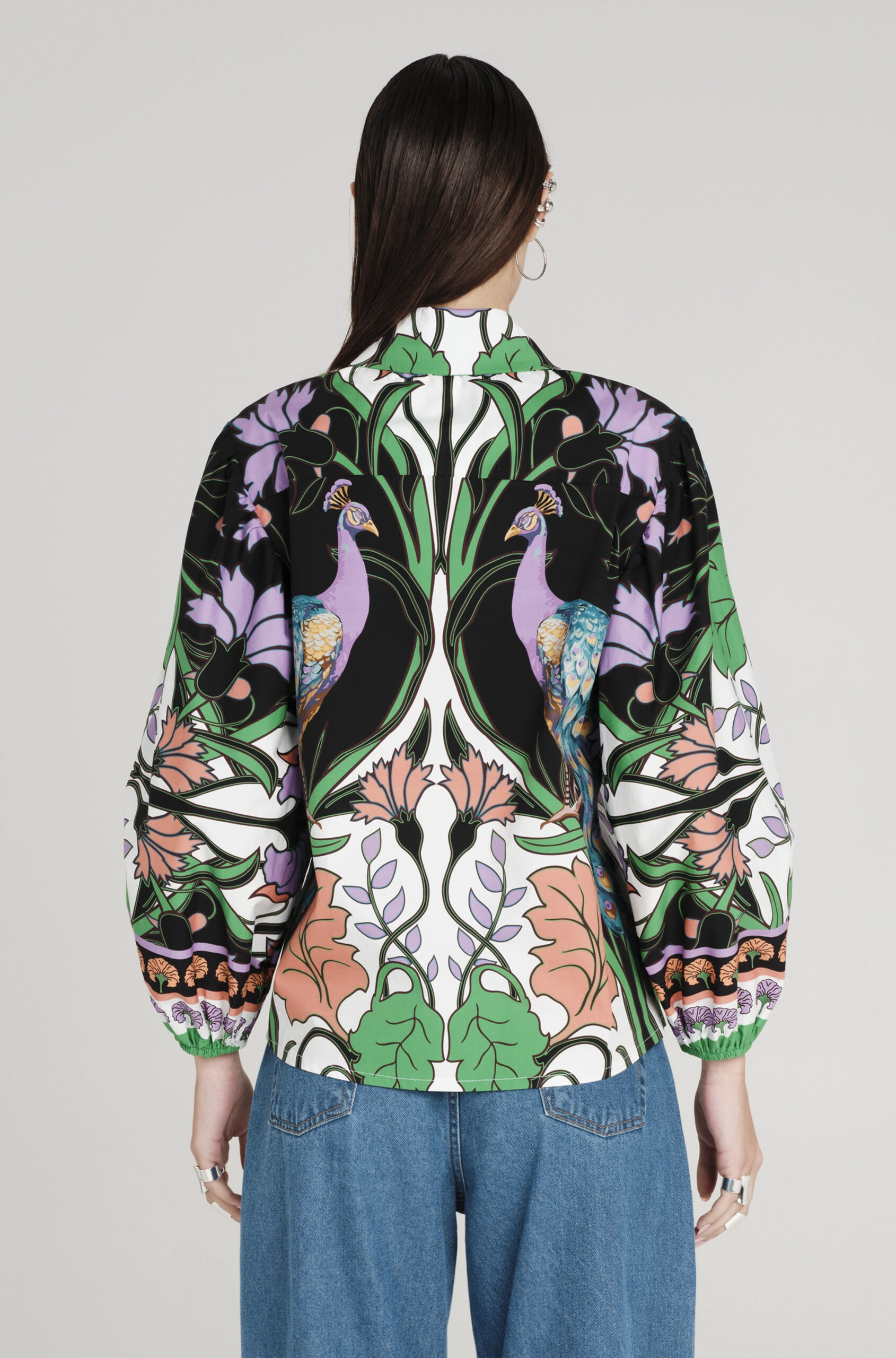 Το Nostalgia Shirt ξεχωρίζει με τα έντονα χρώματά του και τα ιδιαίτερα σχέδια με παγώνια και λουλούδια. Έχει μακριά μανίκια που καταλήγουν σε ελαστικές μανσέτες και κλείνει μπροστά με textured κουμπιά. Είναι κατασκευασμένο από βαμβακερό poplin ύφασμα με ελαφριά ελαστικότητα, προσφέροντας άνεση.