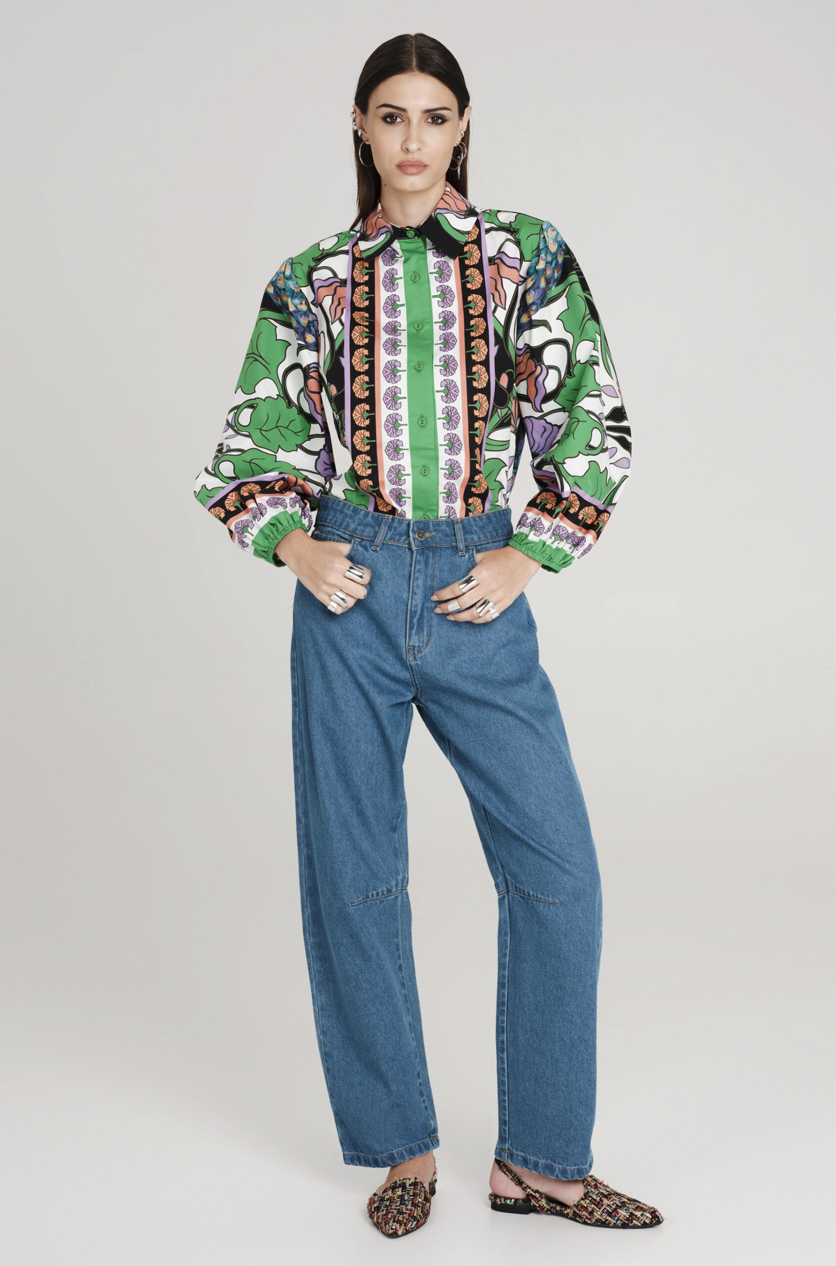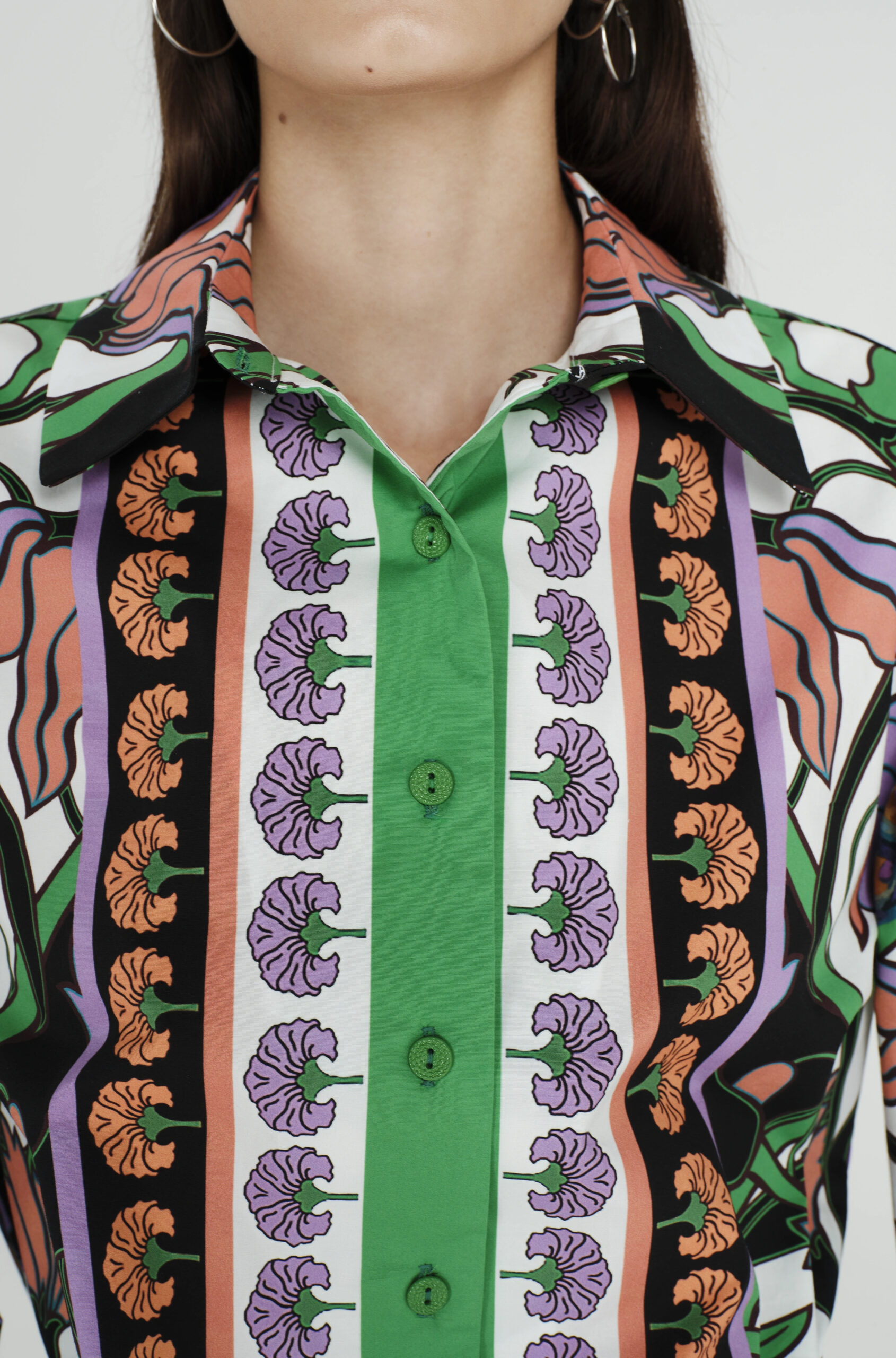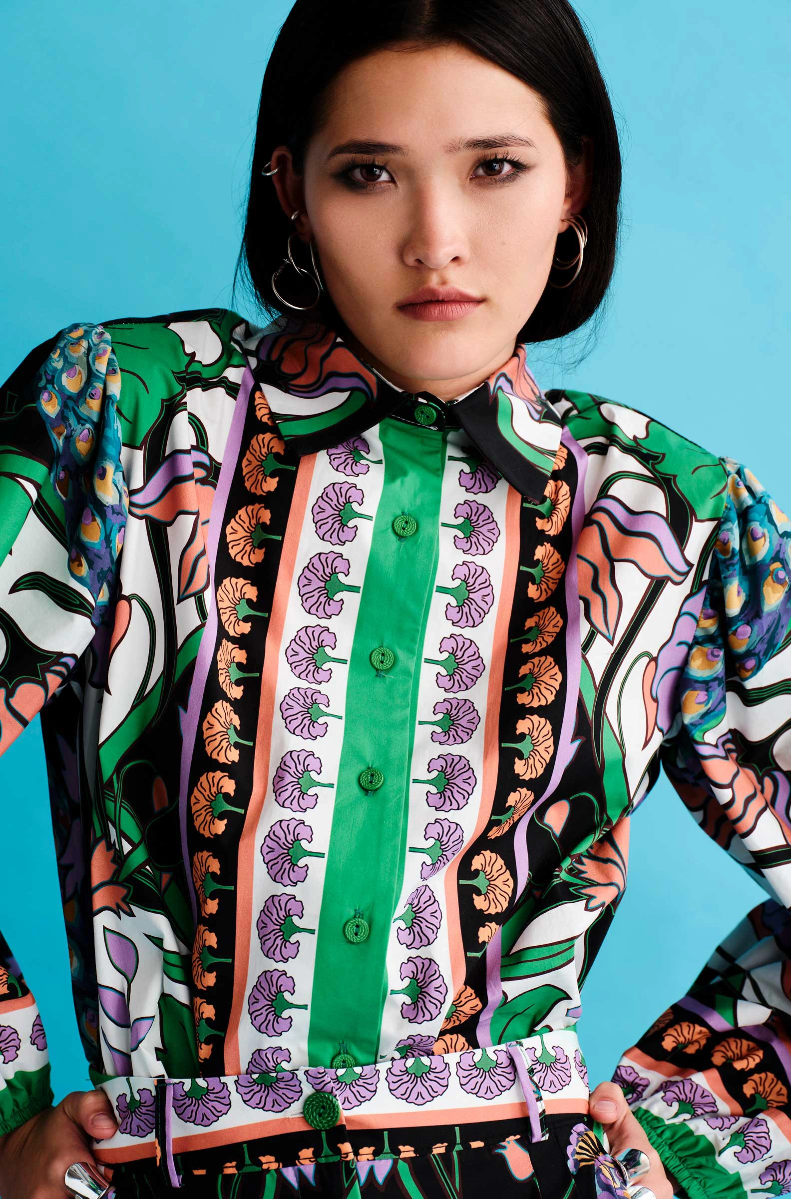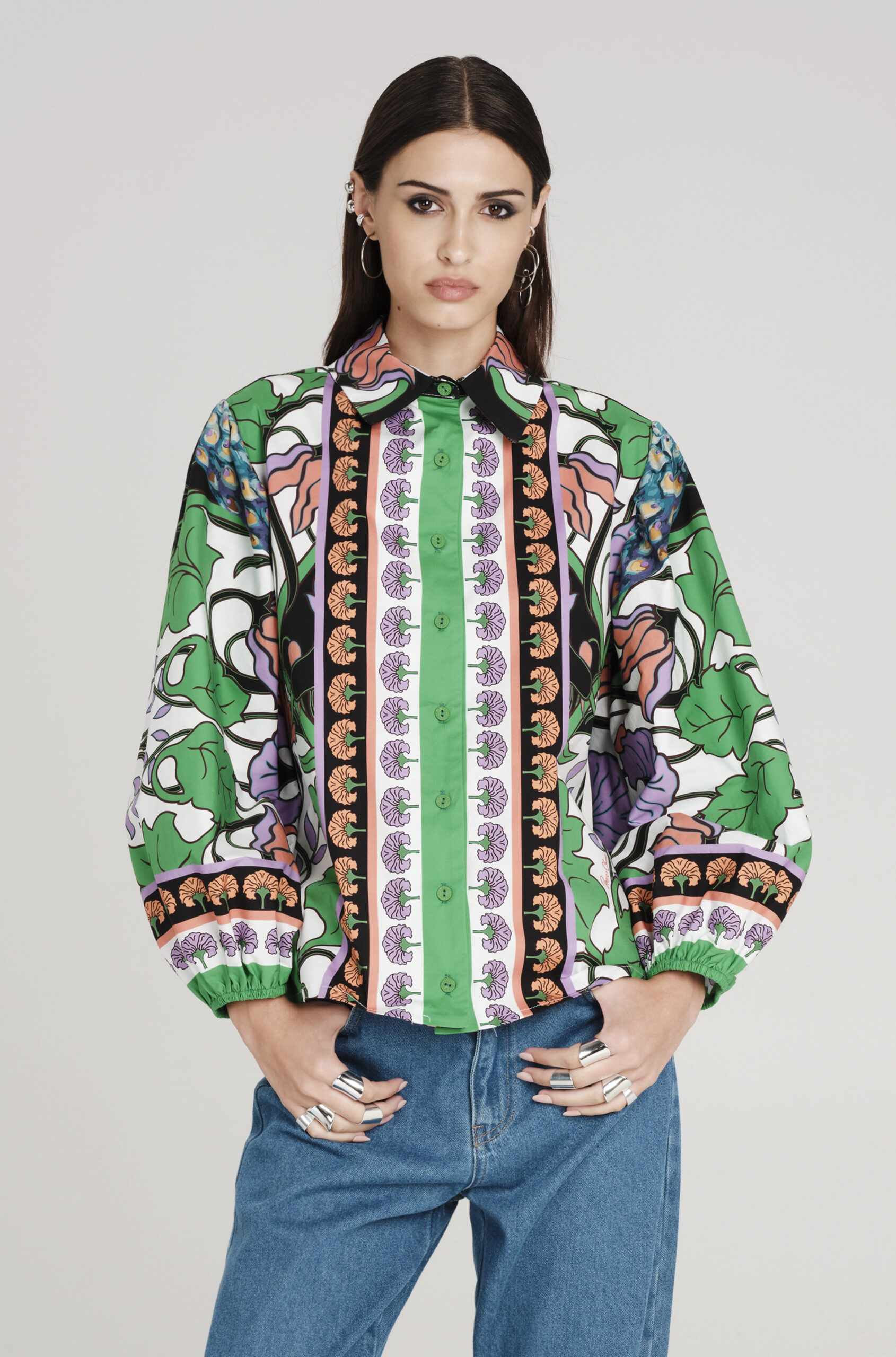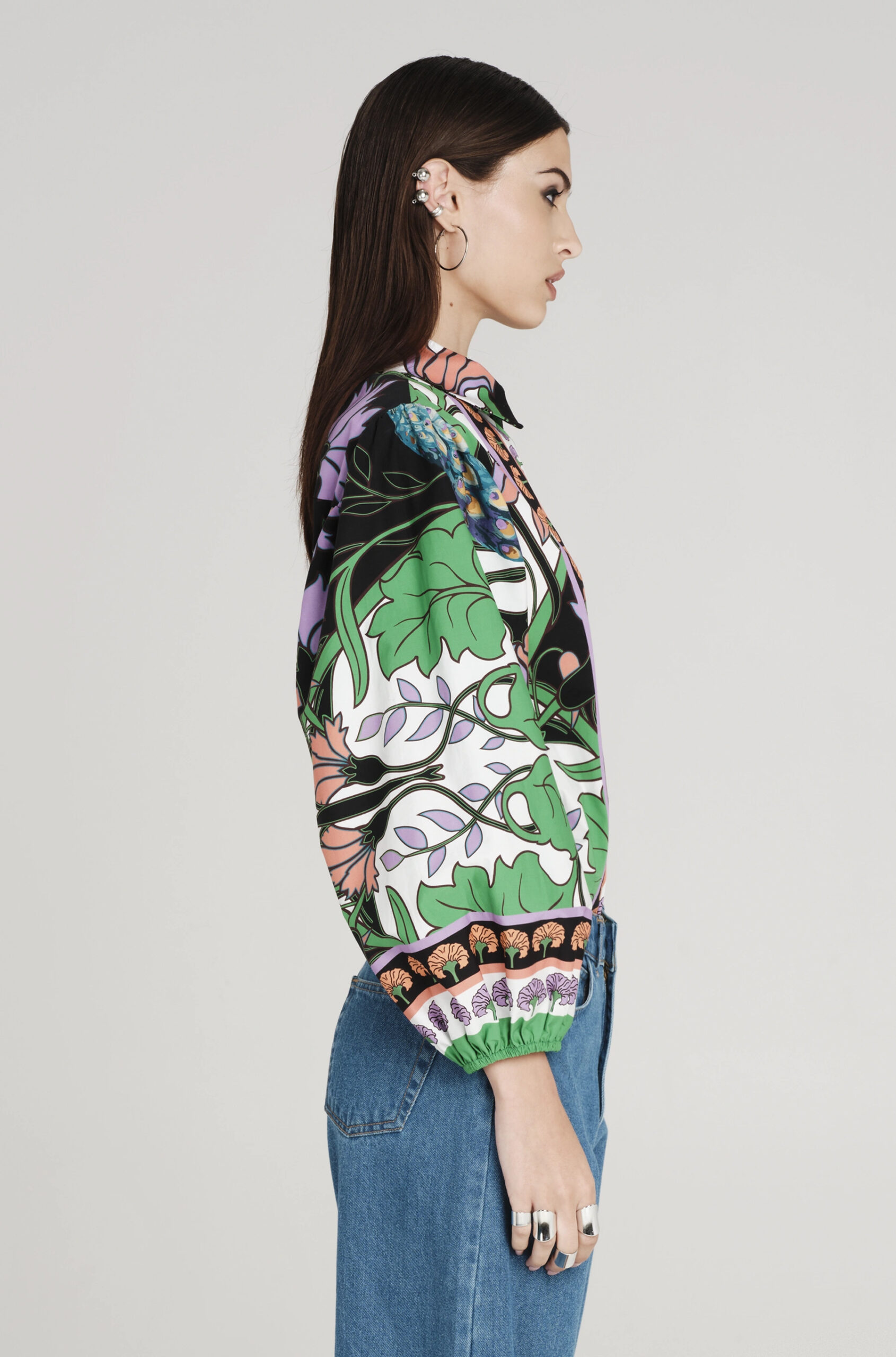 Το Nostalgia Shirt ξεχωρίζει με τα έντονα χρώματά του και τα ιδιαίτερα σχέδια με παγώνια και λουλούδια. Έχει μακριά μανίκια που καταλήγουν σε ελαστικές μανσέτες και κλείνει μπροστά με textured κουμπιά. Είναι κατασκευασμένο από βαμβακερό poplin ύφασμα με ελαφριά ελαστικότητα, προσφέροντας άνεση.