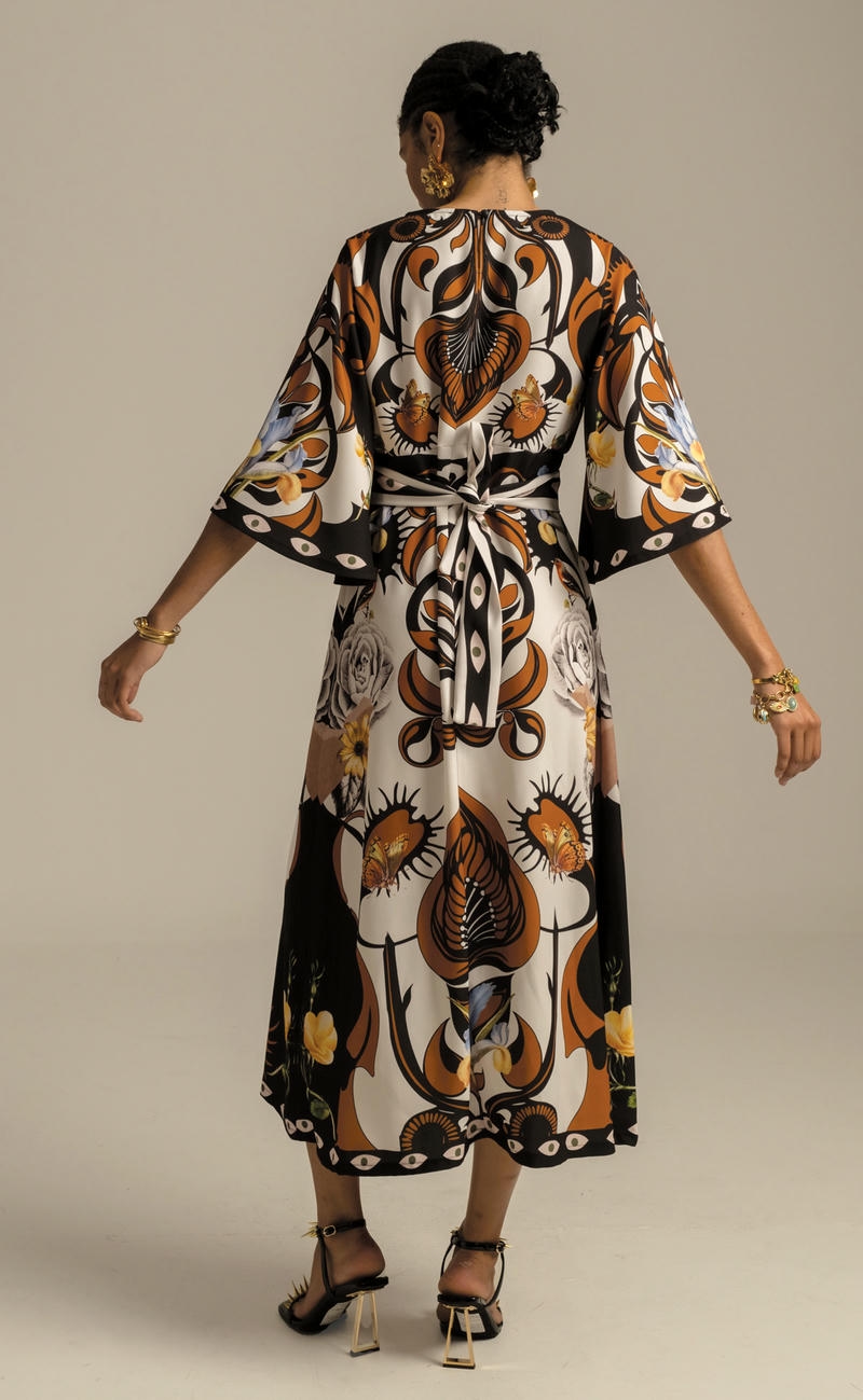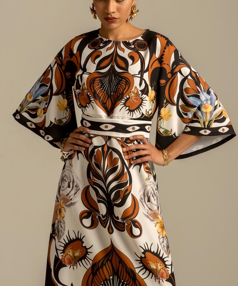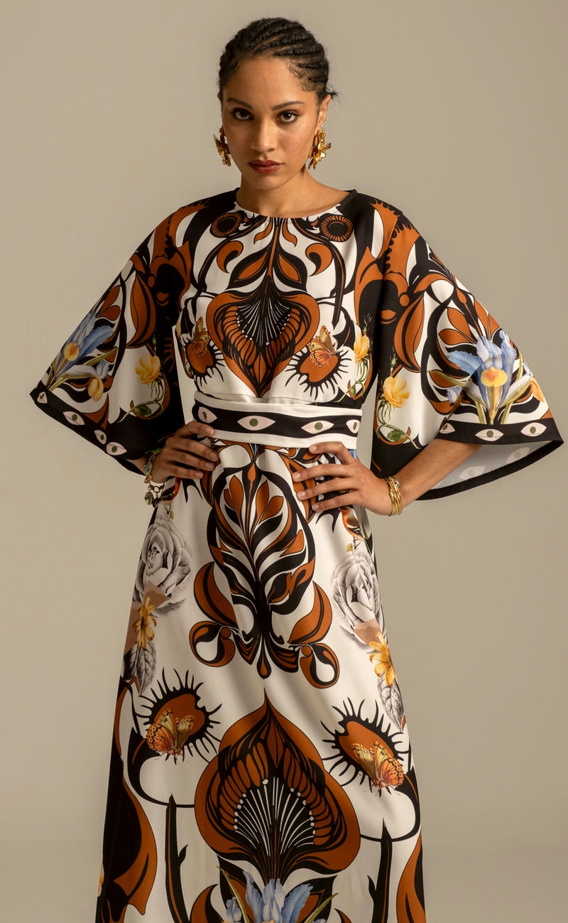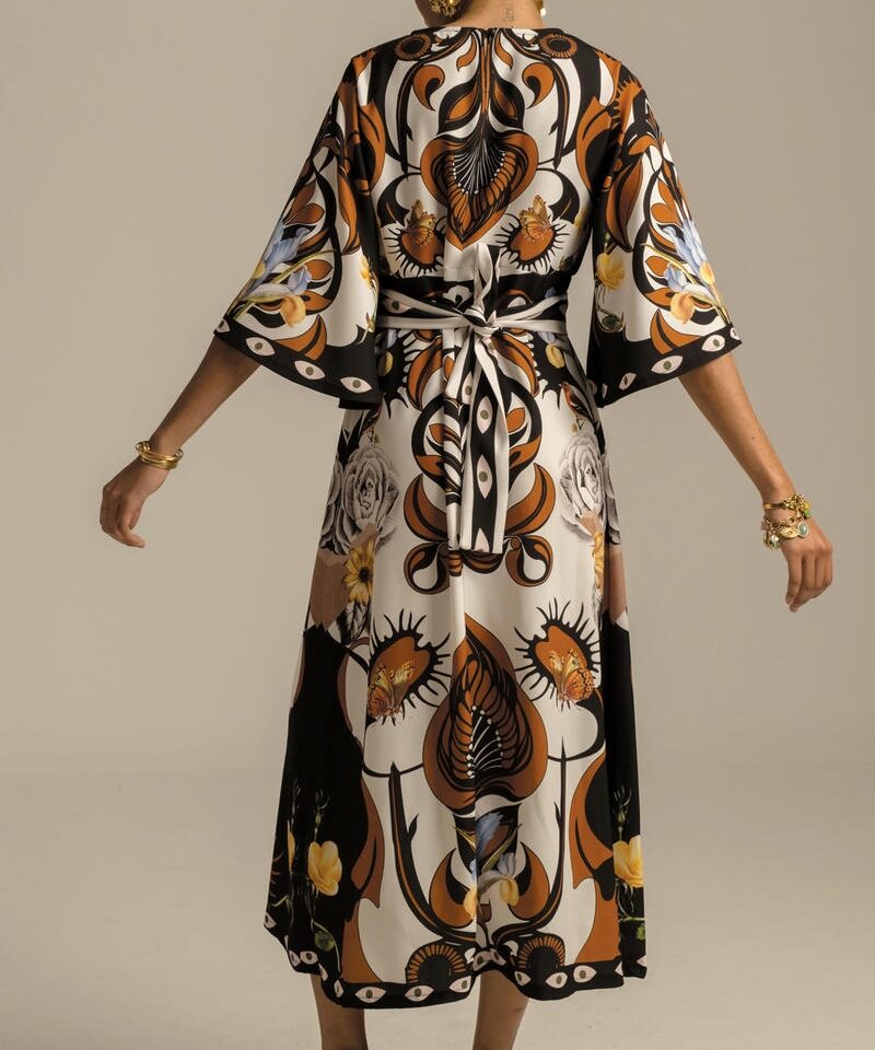 Συνδυάζοντας ένα τύπωμα τοποθέτησης που ενισχύει τη σιλουέτα και ένα κρεπ ελαστικό ύφασμα, το διακοσμητικό μακρύ φόρεμα μας έχει μια όμορφα ντραπέ σιλουέτα σε μίντι γραμμή Α. Περιλαμβάνει μια ζώνη με μοτίβο που τα βλέπει όλα, για να φορεθεί με ή χωρίς, στρογγυλή λαιμόκοψη με κούμπωμα με κουμπιά και θηλιά στο πίσω μέρος και ρομαντικά μανίκια καμπάνα ¾. Φορέστε το στην επόμενη περίστασή σας για απαλή κομψότητα.Ανακαλύψτε το εξαιρετικό τύπωμα αυτού του ρούχου, κατασκευασμένο με την τεχνική τοποθέτησης. Κάθε μέρος του ενδύματος διαθέτει ένα μοναδικό τύπωμα και όταν συνδυάζονται, δημιουργούν ένα πραγματικό αριστούργημα.