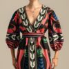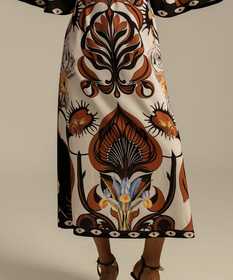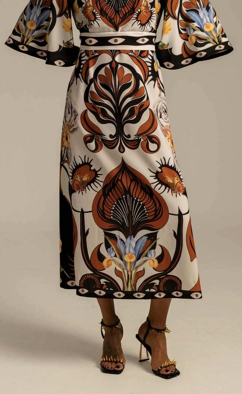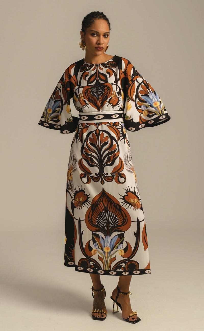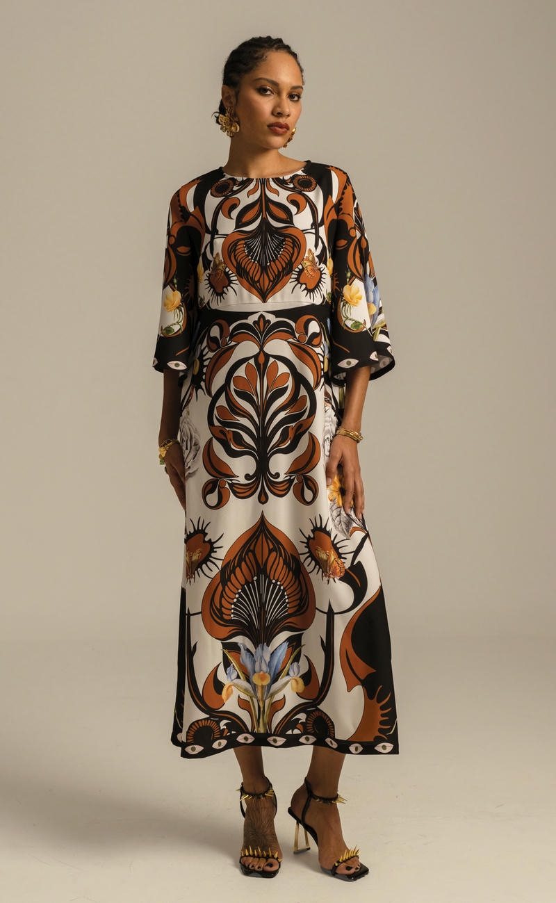 Συνδυάζοντας ένα τύπωμα τοποθέτησης που ενισχύει τη σιλουέτα και ένα κρεπ ελαστικό ύφασμα, το διακοσμητικό μακρύ φόρεμα μας έχει μια όμορφα ντραπέ σιλουέτα σε μίντι γραμμή Α. Περιλαμβάνει μια ζώνη με μοτίβο που τα βλέπει όλα, για να φορεθεί με ή χωρίς, στρογγυλή λαιμόκοψη με κούμπωμα με κουμπιά και θηλιά στο πίσω μέρος και ρομαντικά μανίκια καμπάνα ¾. Φορέστε το στην επόμενη περίστασή σας για απαλή κομψότητα.Ανακαλύψτε το εξαιρετικό τύπωμα αυτού του ρούχου, κατασκευασμένο με την τεχνική τοποθέτησης. Κάθε μέρος του ενδύματος διαθέτει ένα μοναδικό τύπωμα και όταν συνδυάζονται, δημιουργούν ένα πραγματικό αριστούργημα.