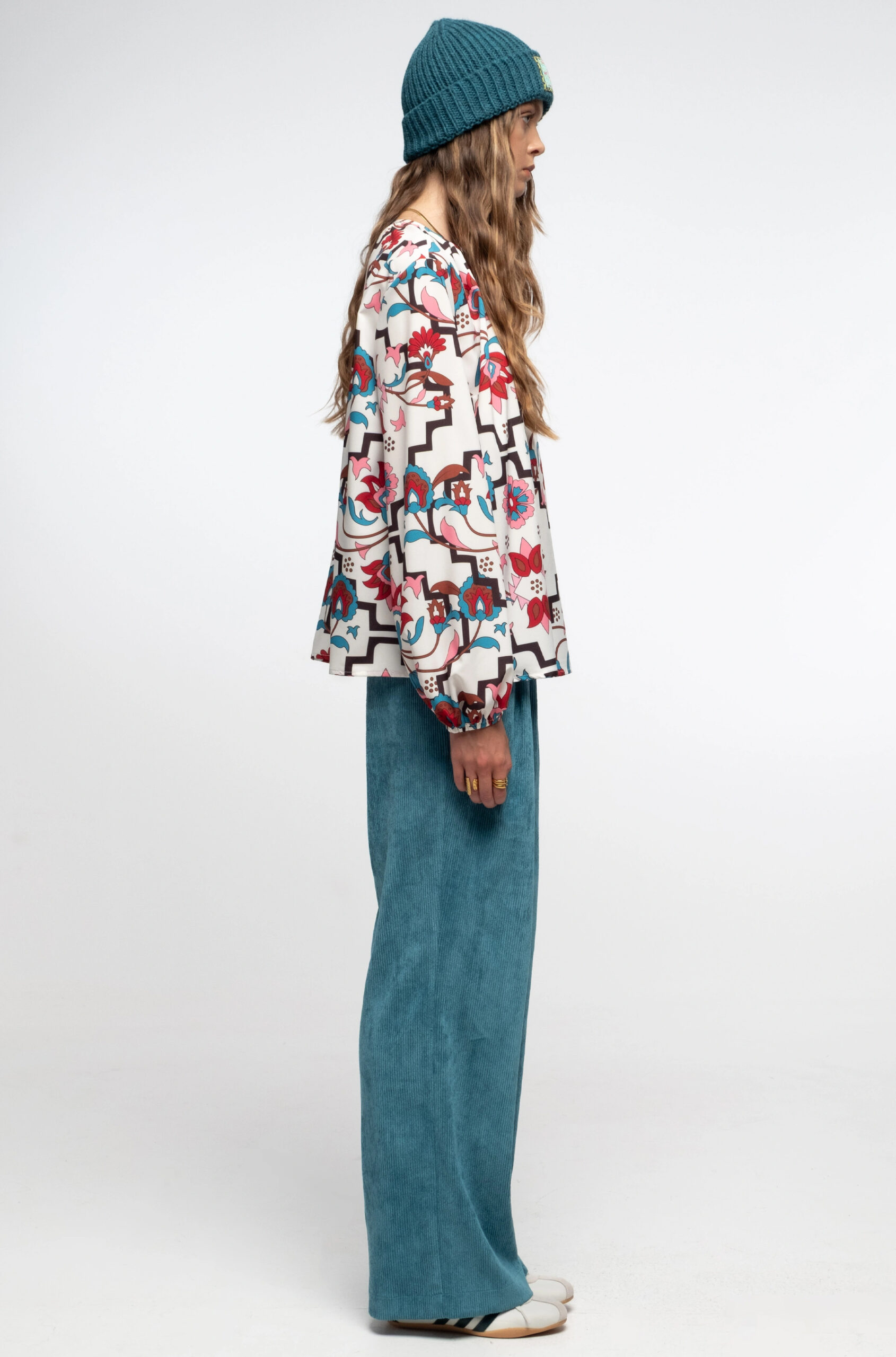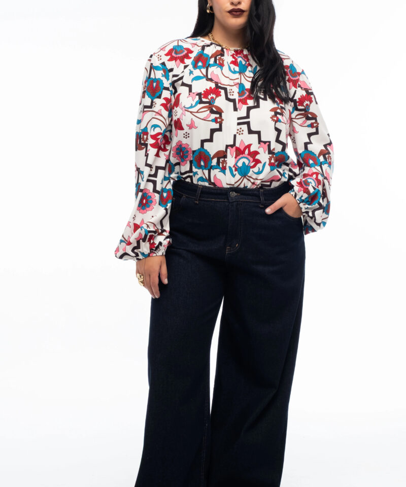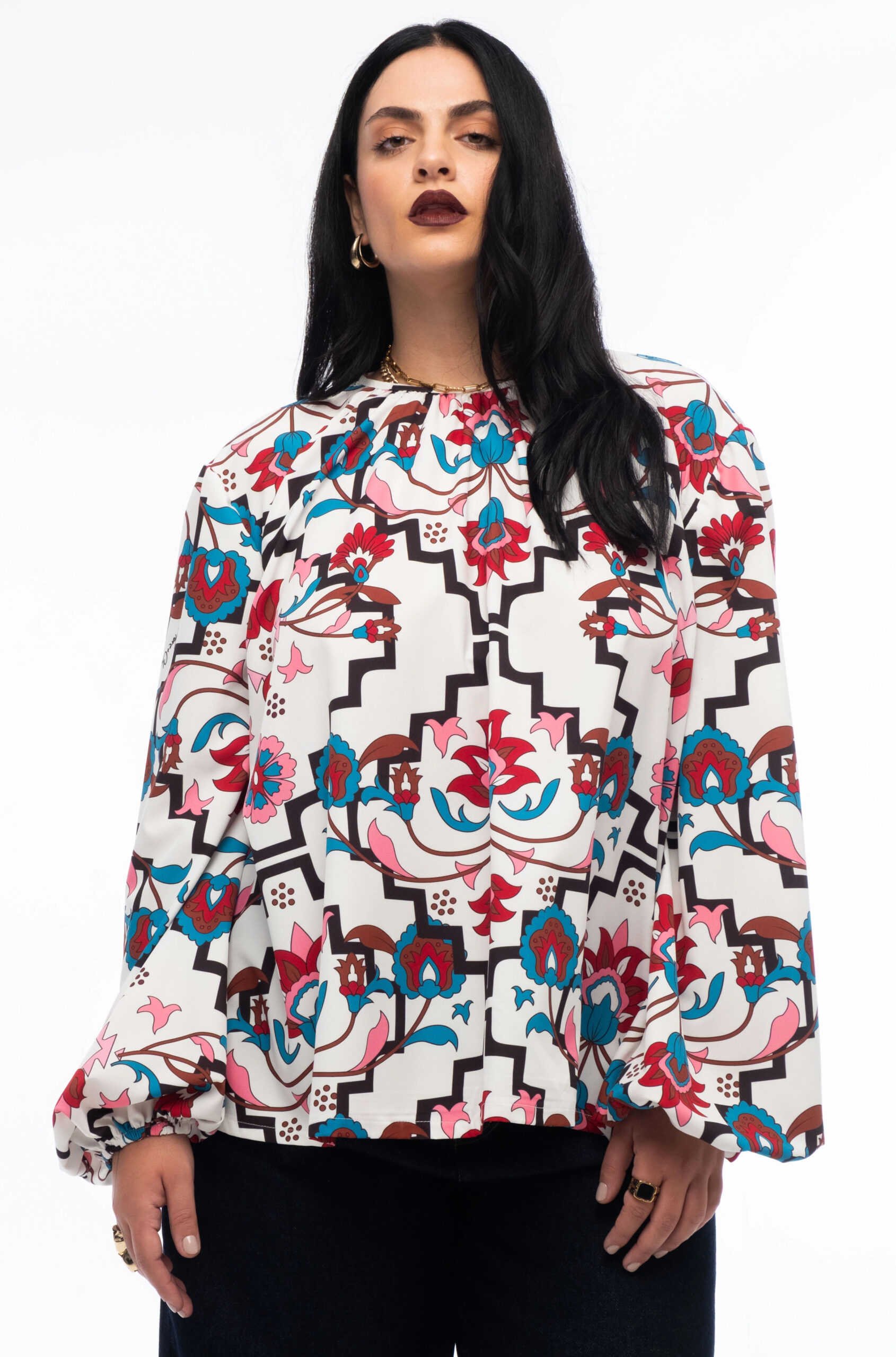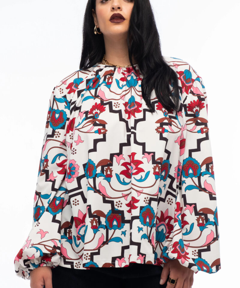 Το Romancer Top έχει όμορφο floral σχέδιο σε εκρού φόντο. Η λαιμόκοψη με σούρες κλείνει στο πίσω μέρος με κουμπί, ενώ τα ελαστικά τελειώματα στα μανίκια του δίνουν ιδιαίτερο στυλ. Συνδυάστε το με το Willow Sleeveless Blazer και το Willow Pants για ένα χρωματικά ταιριαστό σύνολο.
