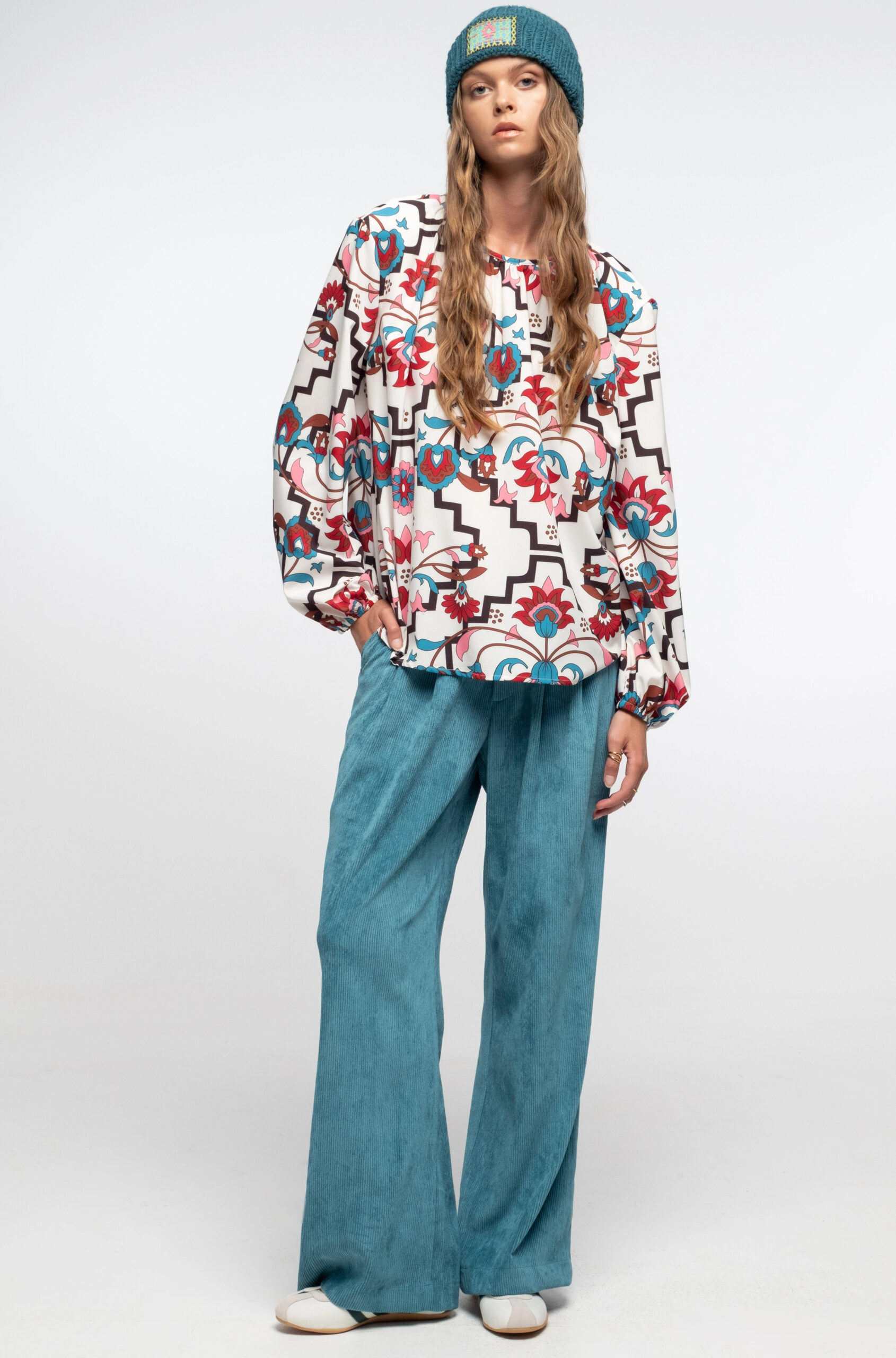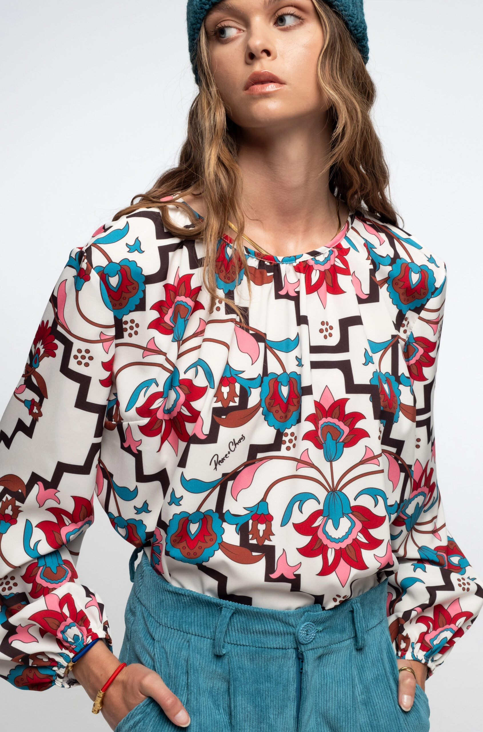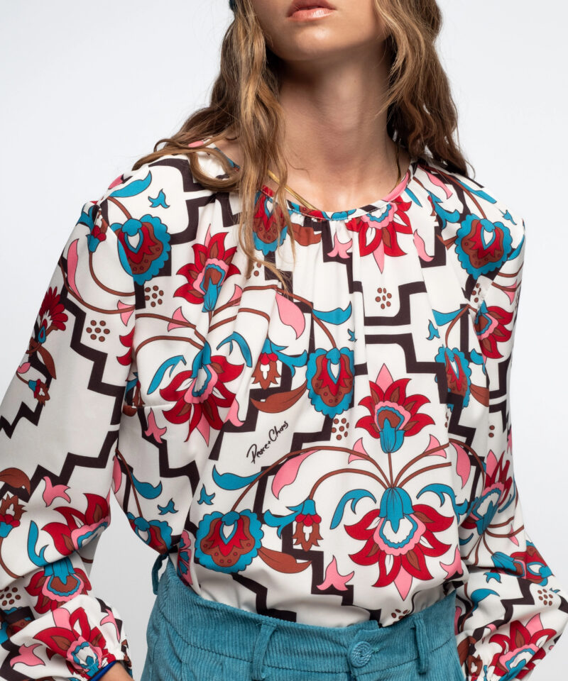 Μπλούζα με σούρες στη λαιμόκοψη, μακριά μανίκια με ελαστικό τελείωμα και κλείσιμο με κουμπί στο πίσω μέρος.