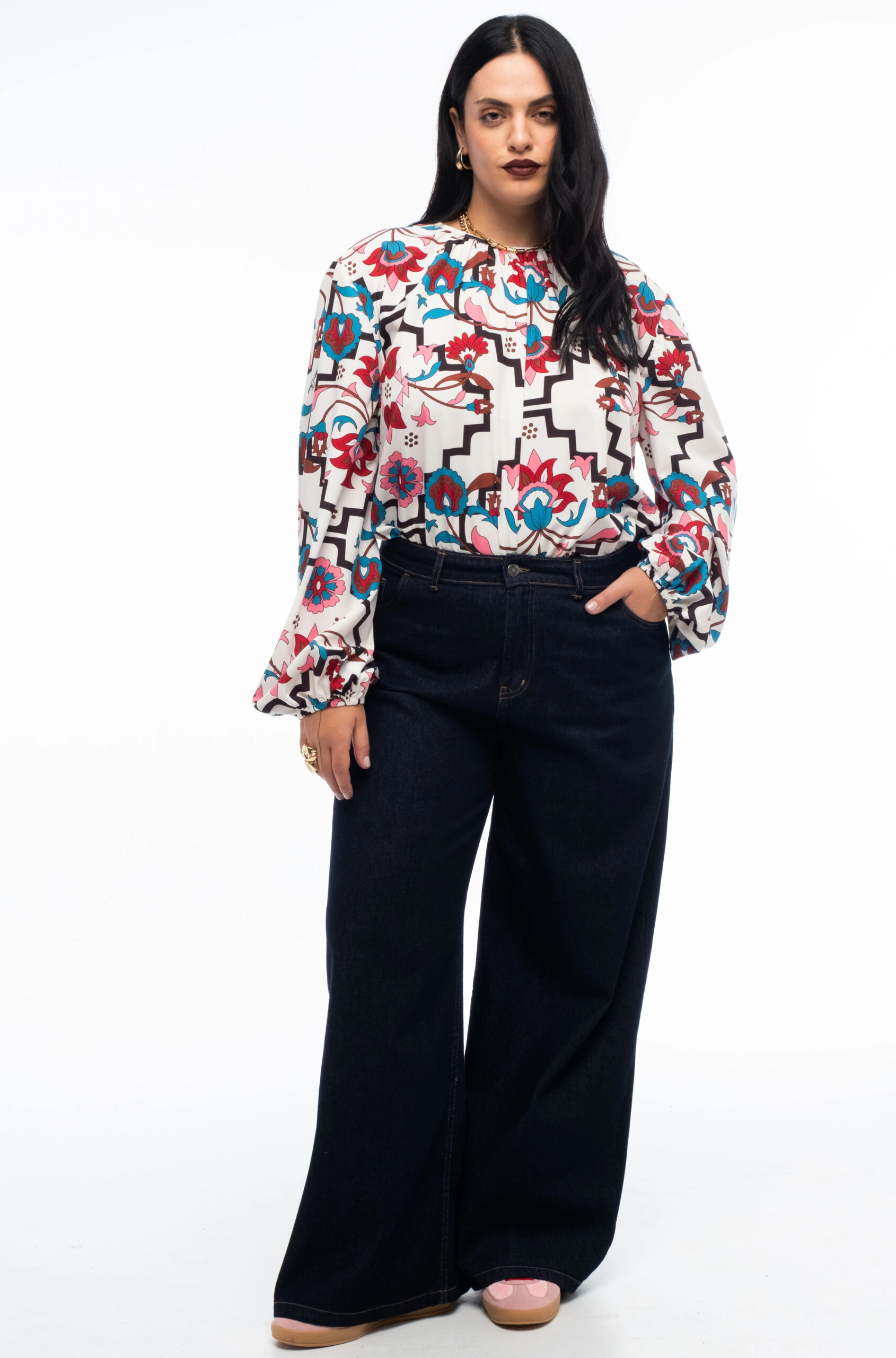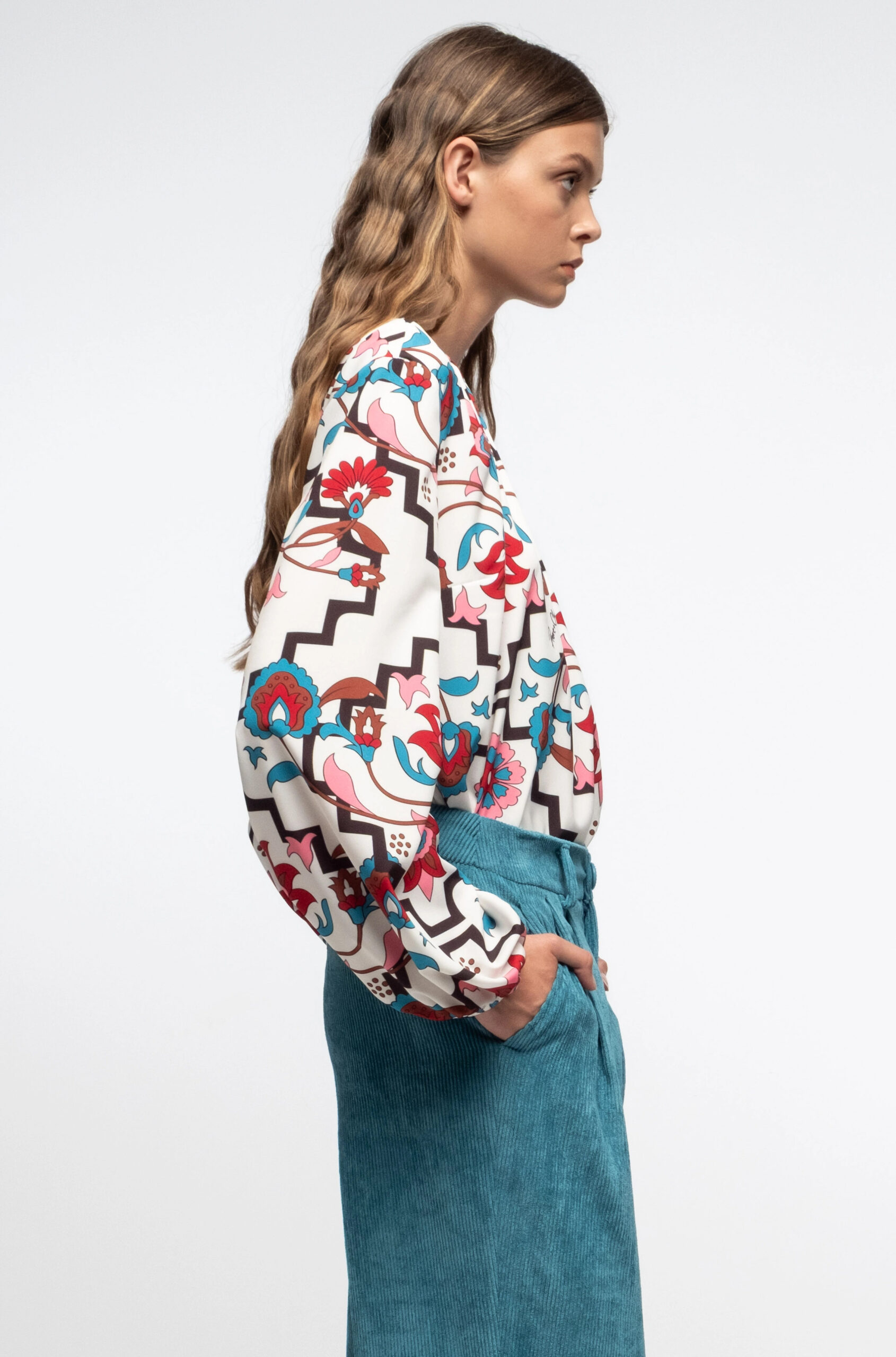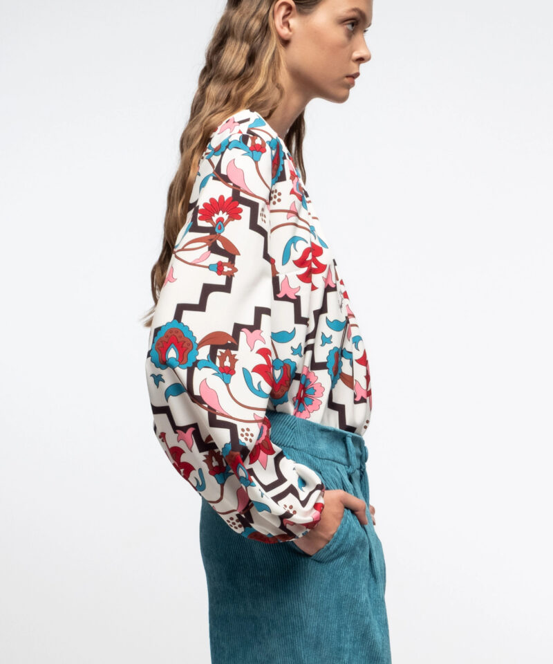 Μπλούζα με σούρες στη λαιμόκοψη, μακριά μανίκια με ελαστικό τελείωμα και κλείσιμο με κουμπί στο πίσω μέρος.